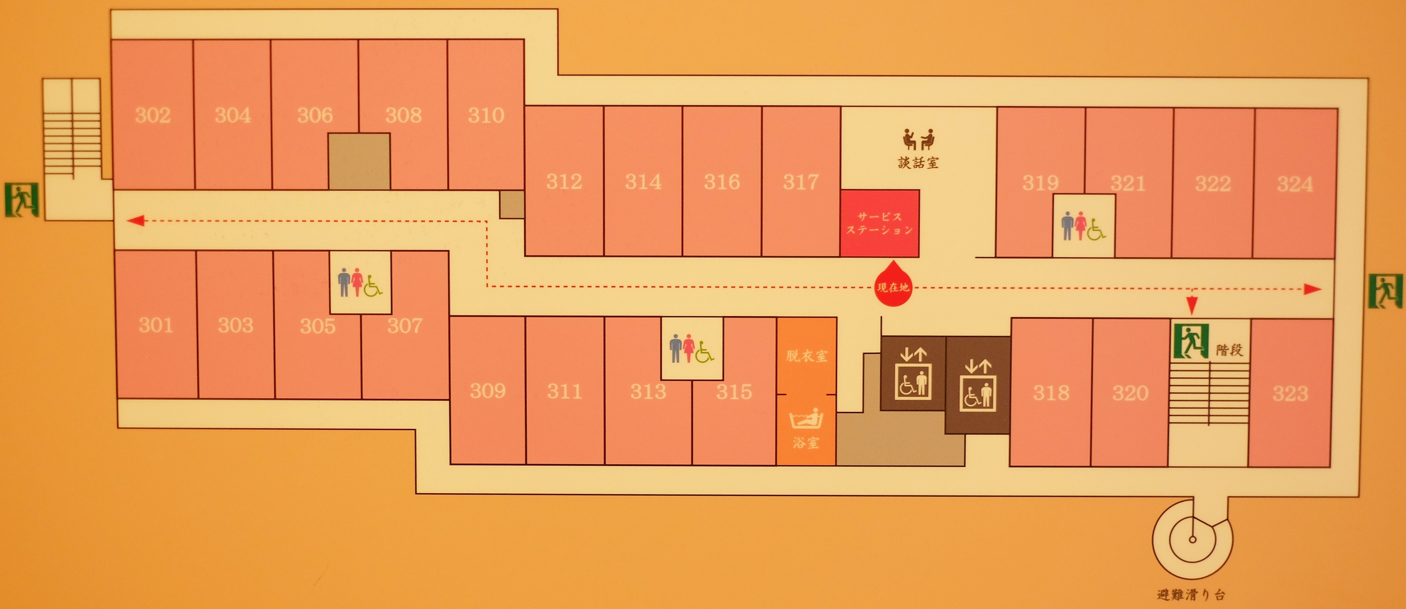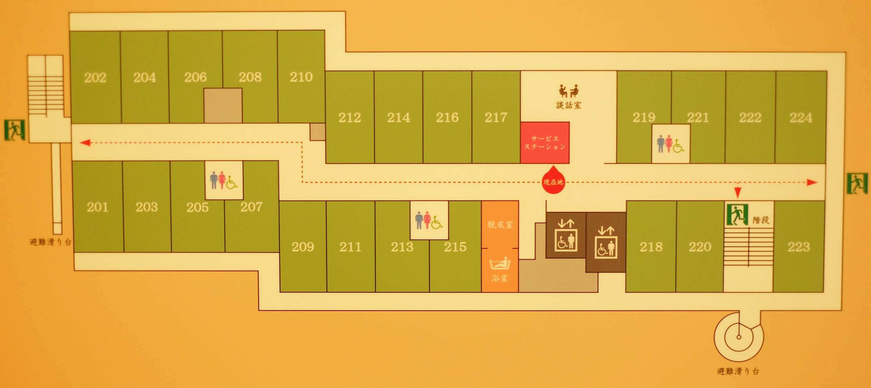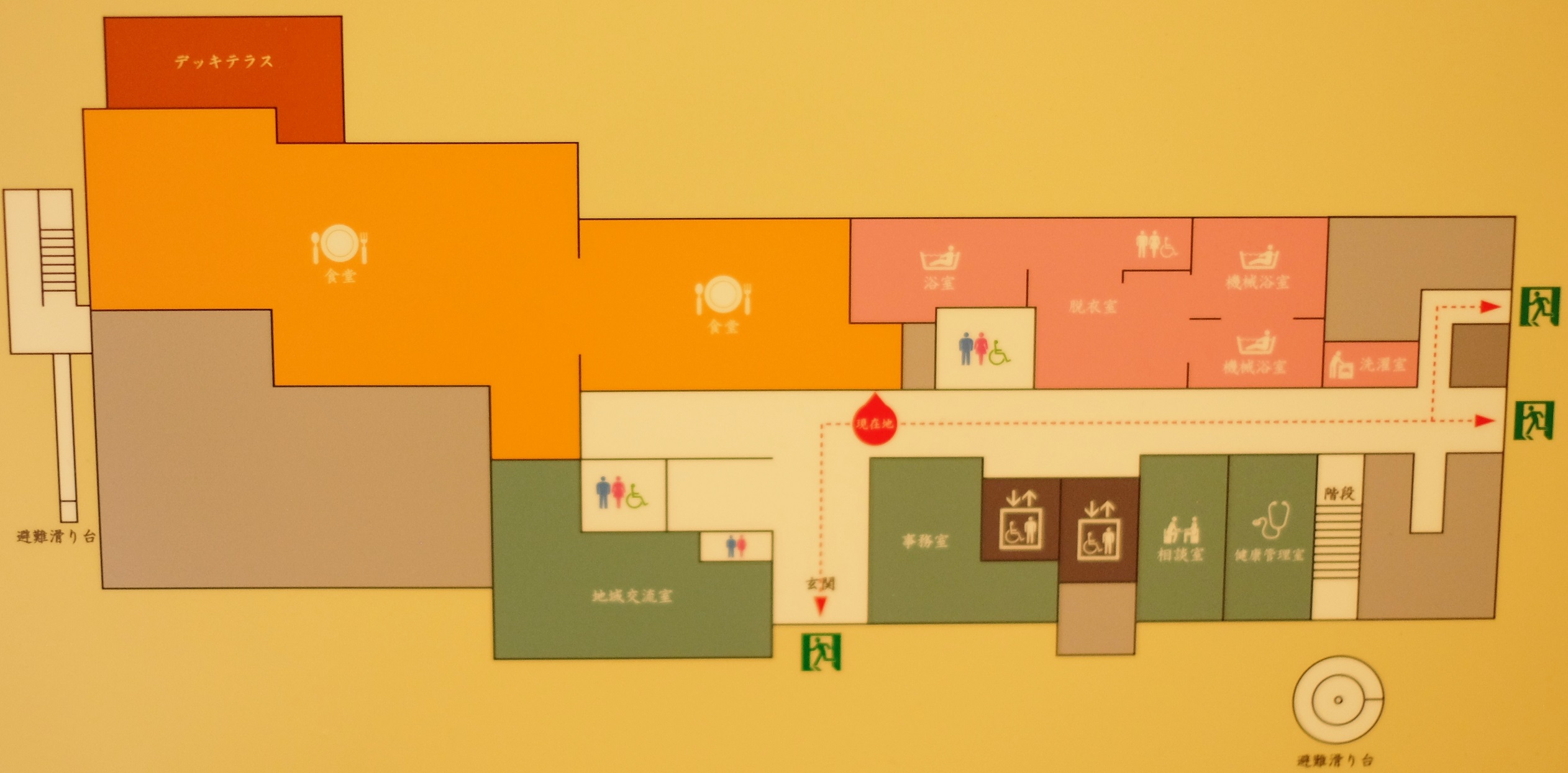 1階は事務室・食堂・浴室(ストレッチャーなどの浴室)・健康管理室・